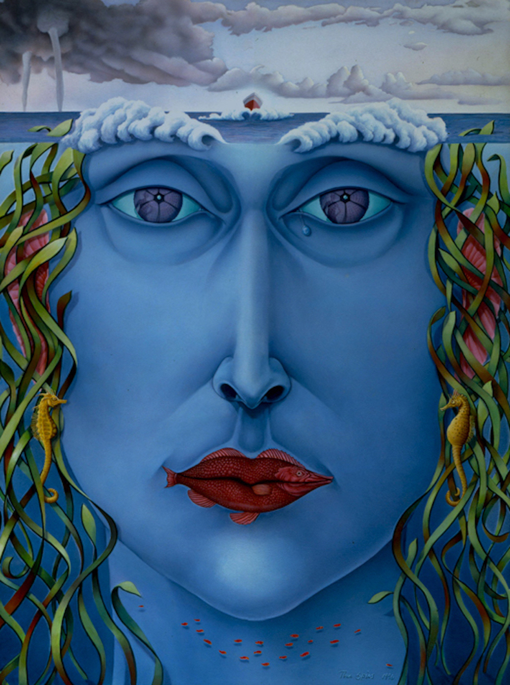 This artwork was designed in a portrait format. In the center is a face of a lady that has features resembling sea creatures, plants and sea waves. As seen in the picture, her hair is made out of seaweed, she has a fish as her lips, and sea waves as her eyebrows. Under her chin is a school of fish swimming. Above her, shows a boat sailing through cloudy weather. The lady overall is depicted as part of the underwater, blending in with the creatures of the sea. In terms of the visual elements, the main colors observed are blue, green and white. Overall, the colors used suits the sea theme very well. (113 words)